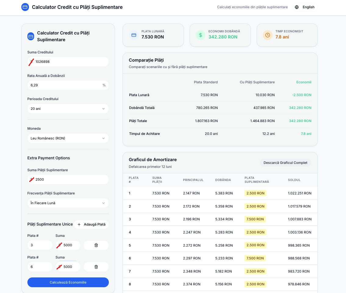 Poți aplica o plată unică (sau mai multe) într-o sumă prestabilită de tine la un anumit moment(e), din graficul de rambursare/scandențar
